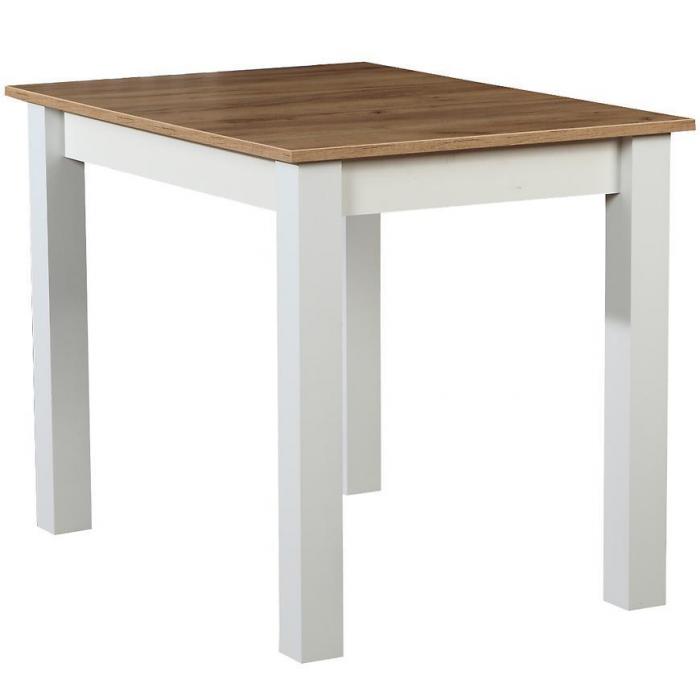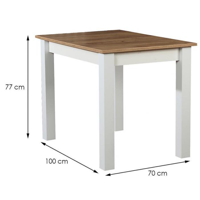 Stół Livia wyróżnia się prostokątnym blatem o wymiarach 100x70 cm, który oferuje wygodną przestrzeń do spożywania posiłków, pracy czy wspólnych spotkań. Wysokość stołu wynosząca 77 cm gwarantuje komfort użytkowania, a matowe wykończenie blatu dodaje subtelnej elegancji i ułatwia utrzymanie powierzchni w czystości. Stół wykonany jest z drewna i płyty laminowanej, co zapewnia trwałość i odporność na codzienne użytkowanie.