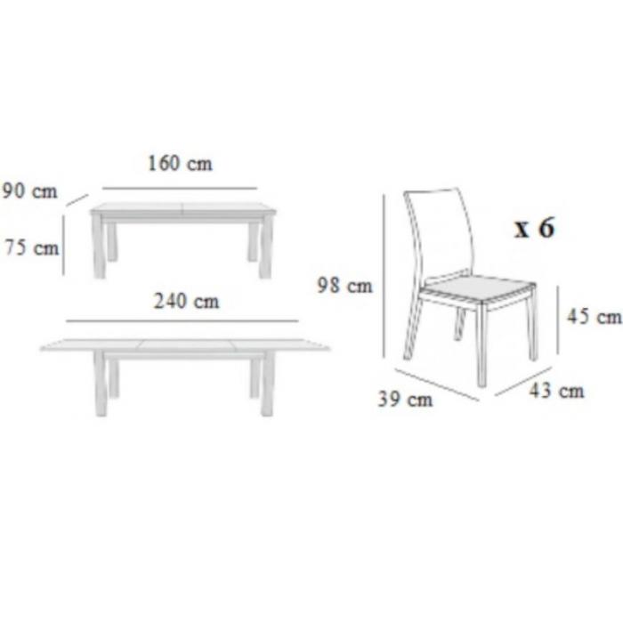 Centralnym punktem zestawu jest solidny stół o prostokątnym blacie, który dzięki funkcji rozkładania dopasowuje się do potrzeb użytkowników. W stanie złożonym ma 160 cm długości, co sprawia, że idealnie pasuje do codziennego użytku, natomiast po rozłożeniu osiąga aż 240 cm – doskonałe rozwiązanie na rodzinne obiady i przyjęcia. Blat w wykończeniu matowym nadaje całości eleganckiego wyglądu, jednocześnie ułatwiając utrzymanie czystości.