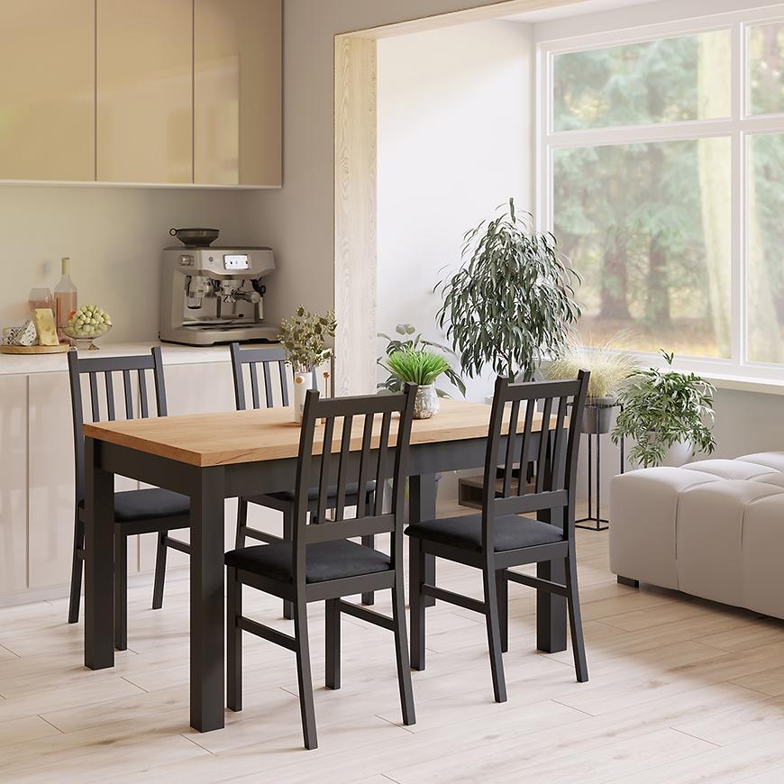 Centralnym punktem zestawu jest prostokątny stół, którego rozkładany blat pozwala na elastyczne dostosowanie przestrzeni do Twoich potrzeb. Przed rozłożeniem świetnie sprawdza się jako codzienny stół do posiłków, natomiast po rozłożeniu oferuje dodatkową przestrzeń, idealną na większe spotkania rodzinne lub towarzyskie. Blat stołu wykończony jest w matowym wybarwieniu, co nadaje mu elegancki, subtelny charakter, jednocześnie ułatwiając utrzymanie go w czystości. Materiał wykonania to połączenie płyty laminowanej i drewna, co zapewnia trwałość oraz odporność na codzienne użytkowanie.