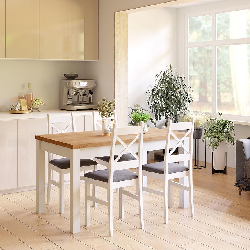 Stół z tego zestawu jest funkcjonalny i wytrzymały. Jego solidna konstrukcja gwarantuje trwałość i stabilność. Stół oferuje wystarczającą przestrzeń, aby wygodnie pomieścić cztery osoby podczas wspólnych posiłków. Możesz również użyć go jako miejsce do pracy lub spotkań towarzyskich.