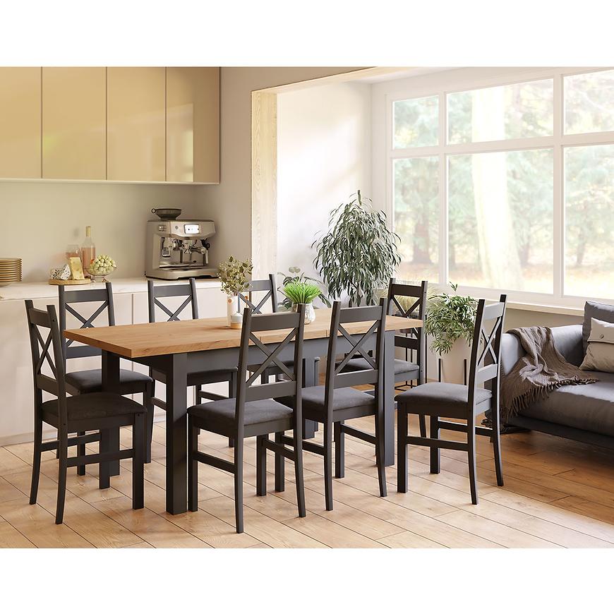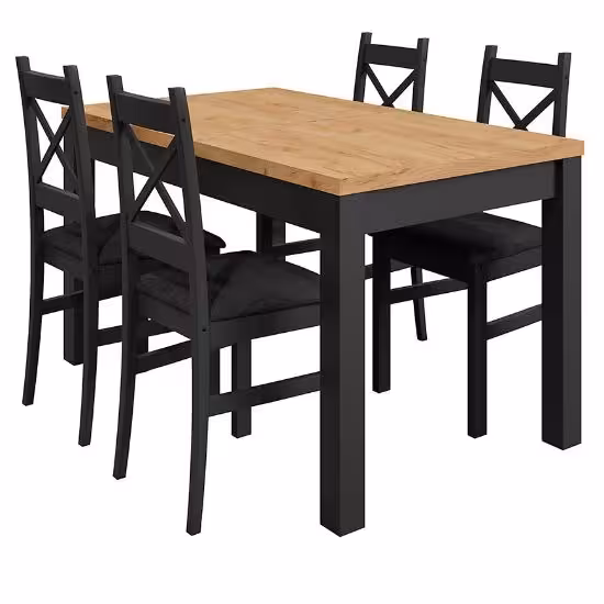 Podsumowując, zestaw stół i krzesła Mini to idealne połączenie nowoczesności, funkcjonalności i stylu. Dostępność w wybarwieniu dąb craft w połączeniu z czernią, cztery krzesła w zestawie oraz minimalistyczny design sprawiają, że ten zestaw jest doskonałym wyborem dla tych, którzy pragną stworzyć wyjątkowe i funkcjonalne miejsce do spożywania posiłków. Zestaw stół i krzesła Mini dodadzą elegancji i wyrafinowania Twojej jadalni lub kuchni.