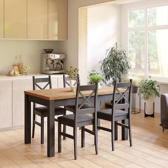 Stół z tego zestawu jest funkcjonalny i solidnie wykonany. Jego prosty design pasuje do różnych stylów wnętrz, dodając pomieszczeniu wyjątkowego charakteru. Stół oferuje wystarczającą przestrzeń, aby pomieścić cztery osoby podczas wspólnych posiłków lub spotkań towarzyskich.