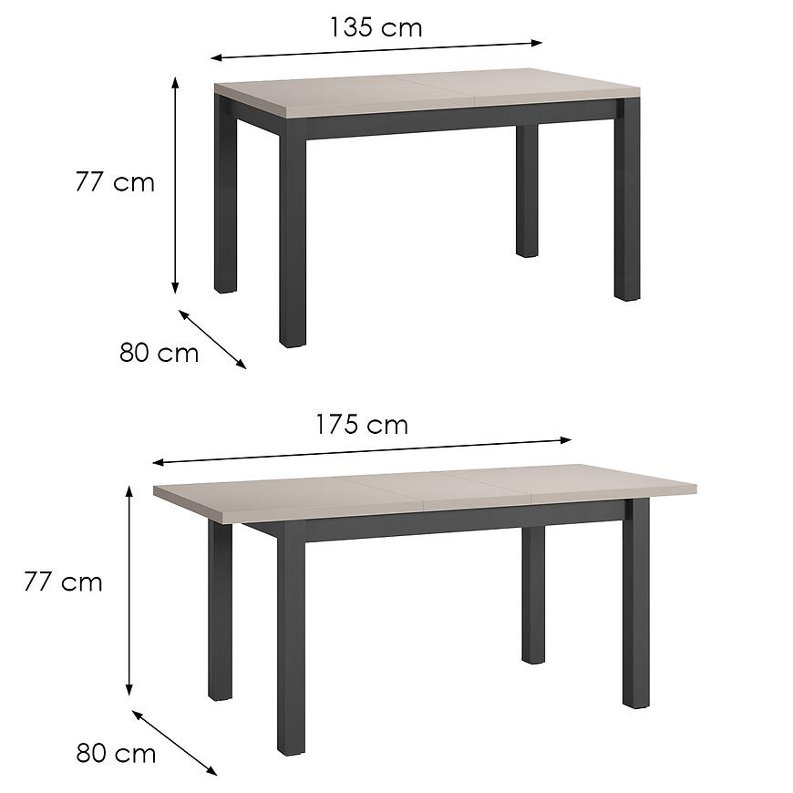 Zestaw Mini w kolorze kaszmir/czarny składa się ze stołu i czterech krzeseł, łącząc nowoczesny styl z funkcjonalnością. Stół ma prostokątny blat o szerokości 80 cm i wysokości 77 cm, jest rozkładany z 135 cm do 175 cm, wykończony matową laminowaną płytą wiórową. Krzesła mają wysokość całkowitą 96 cm, wysokość do siedziska 43 cm, szerokość 42 cm i głębokość 46 cm, siedziska wypełnione pianką i tapicerowane tkaniną w kolorze czarnym. Zestaw waży 96 kg i wymaga samodzielnego montażu.