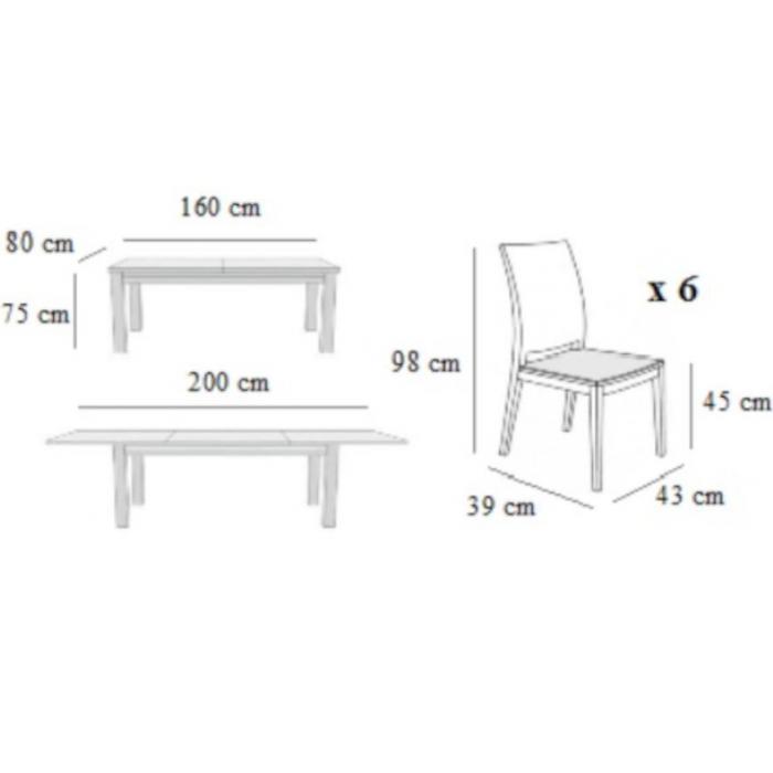 Stół o wymiarach 80 cm szerokości i 78 cm wysokości posiada prostokątny blat, który przed rozłożeniem ma długość 160 cm, a po rozłożeniu aż 200 cm. Dzięki temu zestaw świetnie sprawdzi się podczas rodzinnych obiadów lub spotkań ze znajomymi. Rozkładany stół zapewnia dodatkową przestrzeń, gdy jest to potrzebne, a jego matowe wykończenie blatu nadaje wnętrzu subtelnej elegancji.
