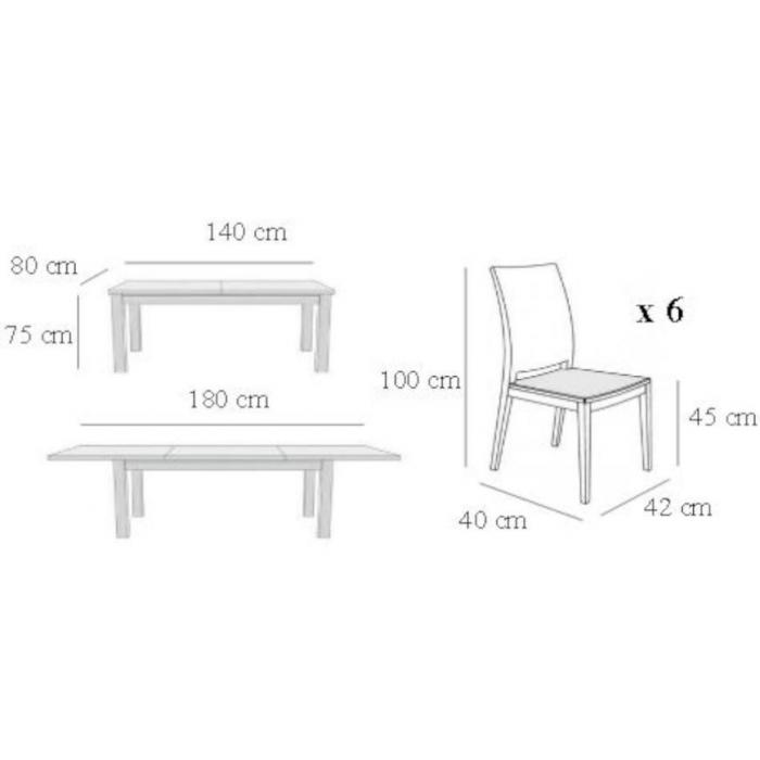 Stół w zestawie Nadia 2 1+6 ma szerokość 80 cm i wysokość 75 cm. Jego długość przed rozłożeniem wynosi 140 cm, a po rozłożeniu aż 180 cm, co umożliwia wygodne przyjęcie większej liczby gości. Blat stołu wykonany jest z naturalnej okleiny, wykończony w macie, co podkreśla elegancję mebla i ułatwia utrzymanie czystości. Kształt prostokątny sprawia, że stół pasuje zarówno do mniejszych, jak i przestronnych pomieszczeń.