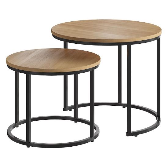 Stelaż stolików wykonany jest z metalu, co nadaje im surowego, industrialnego wyglądu. Metalowe nogi w połączeniu z drewnopodobnym blatem tworzą harmonijną całość, która doskonale sprawdzi się w loftowych aranżacjach lub wnętrzach inspirowanych przemysłowym stylem.