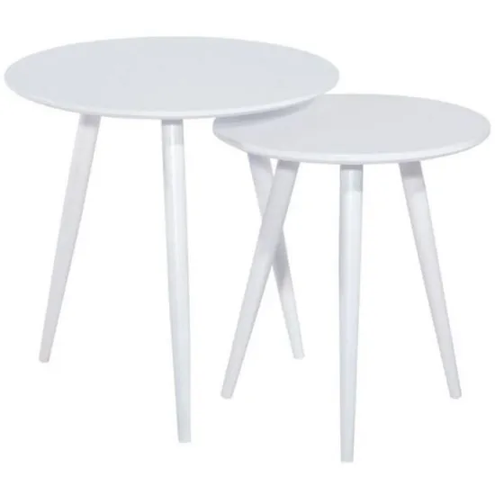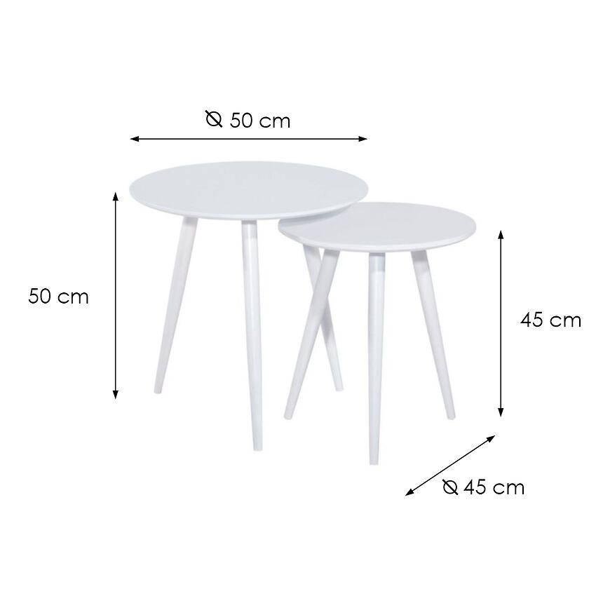 Zestaw stolików Reda w białym wybarwieniu składa się z dwóch okrągłych stolików o wymiarach 50x50 cm i 45x40 cm, o wysokościach odpowiednio 50 i 45 cm. Blaty wykonane są z matowej płyty MDF, a stelaże z drewna nadają im klasyczny charakter. Stolik waży 6 kg, nie jest rozkładany, wymaga samodzielnego montażu i stanowi elegancki, funkcjonalny element wnętrza.