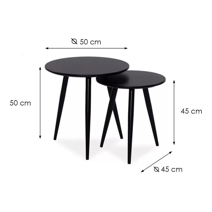 Zestaw stolików Reda w czarnym wybarwieniu składa się z dwóch okrągłych stolików o wymiarach 50x50 cm i 45x40 cm, o wysokościach odpowiednio 50 i 45 cm. Blaty wykonane są z matowej płyty MDF, a stelaże z drewna nadają im klasyczny charakter. Stolik waży 6 kg, nie jest rozkładany, wymaga samodzielnego montażu i stanowi elegancki, funkcjonalny element wnętrza.