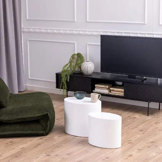 Nowoczesny styl i owalny blat o matowym wykończeniu nadają im wyjątkowy charakter, doskonale pasujący do współczesnych aranżacji. Wykonane z wysokiej jakości płyty MDF, zapewniają trwałość i łatwość w utrzymaniu czystości. Dzięki kompaktowym wymiarom (40 cm wysokości, 33 cm szerokości, 48 cm długości) stoliki idealnie sprawdzą się zarówno w salonie, jak i w sypialni czy przestrzeni biurowej.