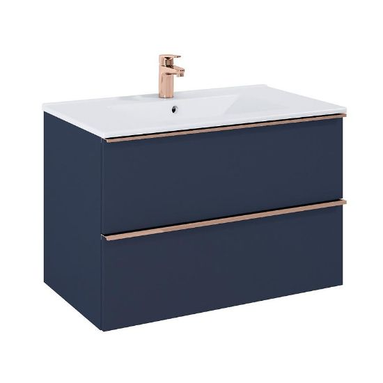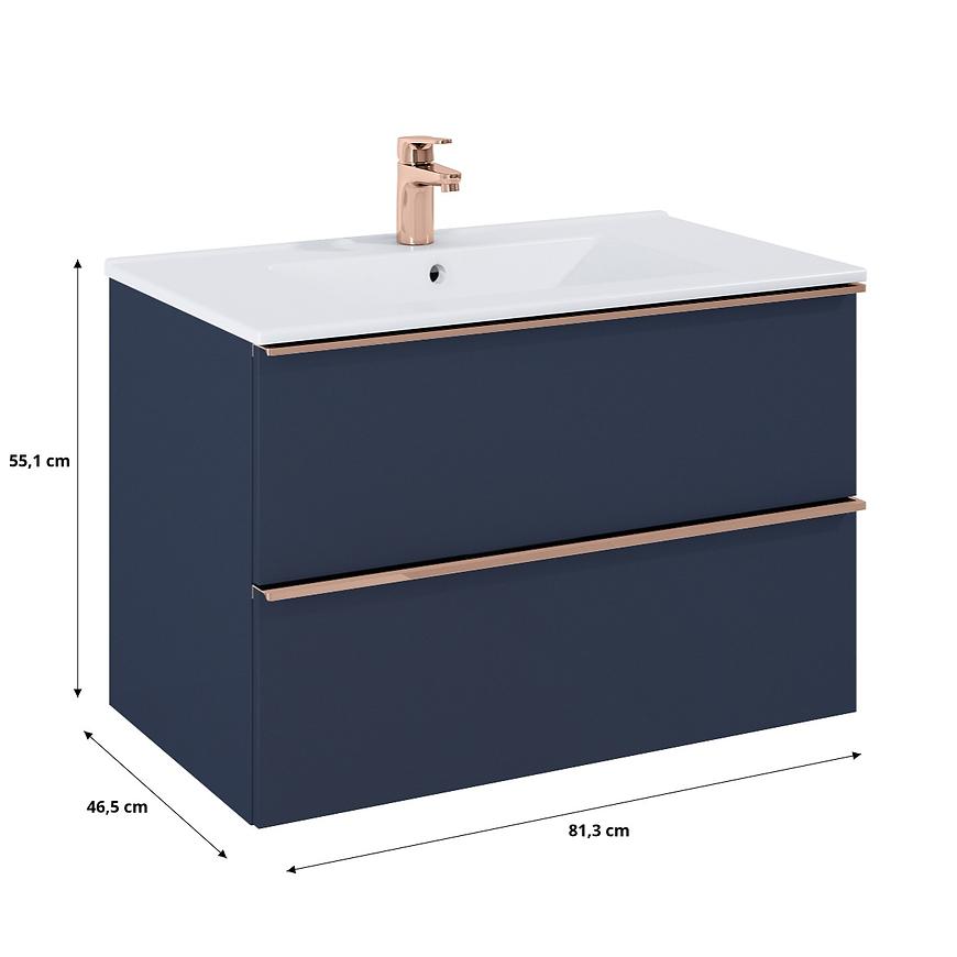 Wykończenie laminatem matowym w kolorze navy blue nadaje szafce eleganckiego i nowoczesnego wyglądu, który harmonizuje z różnymi stylami wnętrz. System samodomykania drzwi i szuflad zapewnia płynne i ciche zamykanie, podnosząc komfort użytkowania.