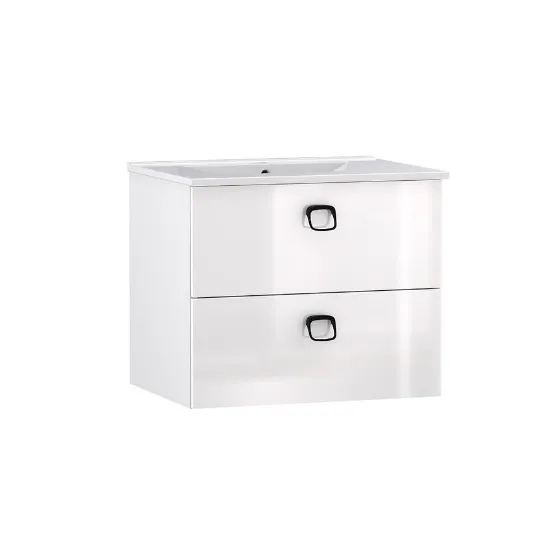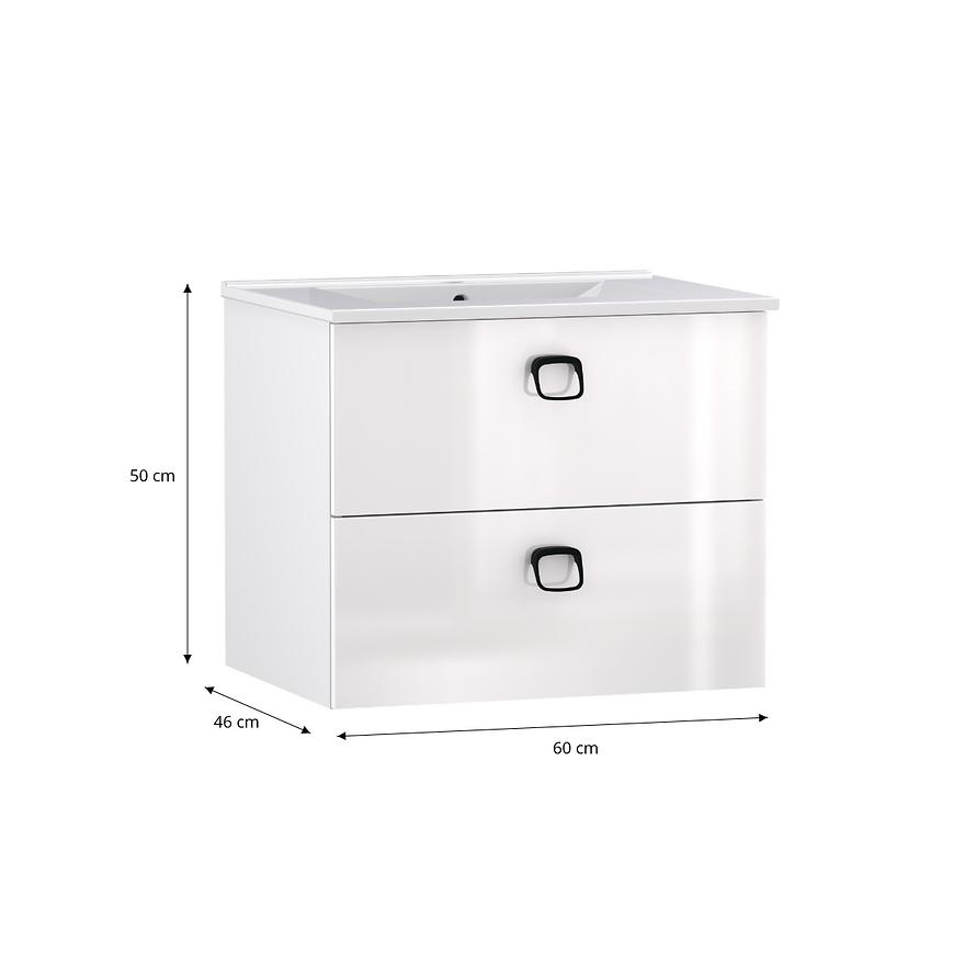 Zestaw szafka z umywalką Teone 60 2S to stylowe i funkcjonalne rozwiązanie do łazienki. Produkt z kolekcji TEONE ma wymiary: wysokość 50 cm, szerokość 60 cm, głębokość 46 cm, a jego waga to 27,5 kg. Szafka wykonana jest z płyty wiórowej, front wykończony lakierem, a korpus laminatem w kolorze białym. Wyposażona w system samodomykania, przeznaczona jest do samodzielnego montażu. To podwieszana, 2-szufladowa szafka łazienkowa z umywalką w zestawie (bez baterii).