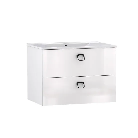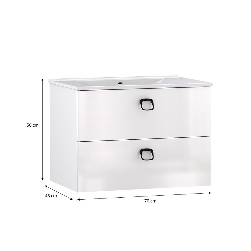 Zestaw szafka z umywalką Teone 70 2S to eleganckie i praktyczne wyposażenie do łazienki. Pochodzi z kolekcji TEONE i ma wymiary: wysokość 50 cm, szerokość 70 cm, głębokość 46 cm, przy wadze 31,5 kg. Szafka wykonana z płyty wiórowej, front pokryty lakierem, a korpus laminatem w kolorze białym. Wyposażona w system samodomykania, przeznaczona jest do samodzielnego montażu. To podwieszana, 2-szufladowa szafka łazienkowa z umywalką w zestawie (bez baterii).