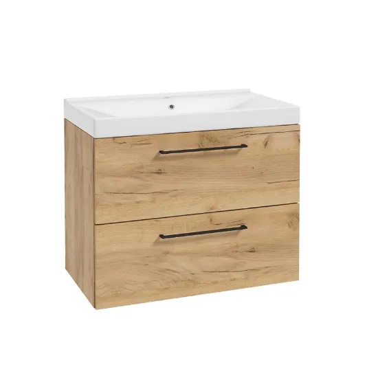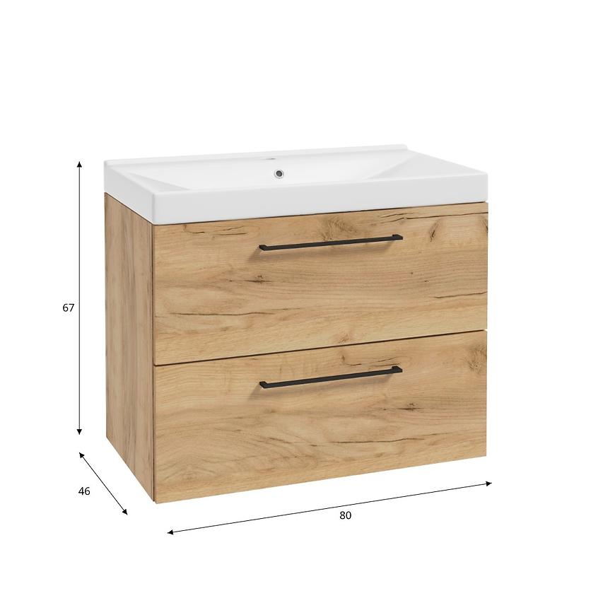 Zestaw szafka z umywalką Vesper D80 0D2S dąb złoty z kolekcji VESPER to przestronna i elegancka szafka łazienkowa podwieszana z umywalką w zestawie. Wykonana z płyty wiórowej z frontem i korpusem w dekorze dąb złoty, łączy trwałość z nowoczesnym designem. Posiada 2 szuflady z systemem samodomykania i uchwyty w komplecie, zapewniając wygodne przechowywanie. Produkt do samodzielnego montażu, idealny do każdej łazienki, wprowadzając ciepło i styl wnętrza.