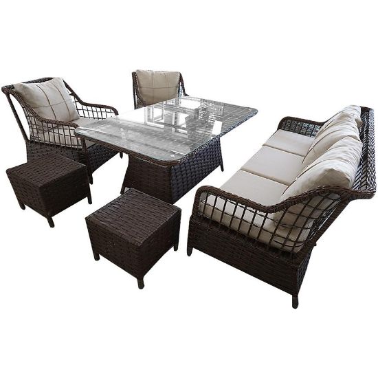 sofa, 2 fotele, wysoki stół, 2 pufy