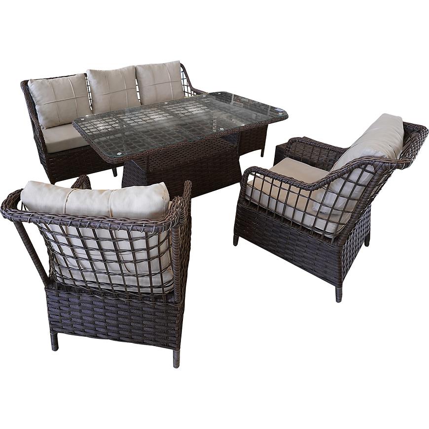 Meble wykonane są z wysokiej jakości technorattanu, który nie tylko imituje naturalny rattan, lecz także charakteryzuje się odpornością na warunki atmosferyczne, promieniowanie UV oraz wilgoć. Lekkość, wytrzymałość i łatwość utrzymania w czystości to cechy, które wyróżniają ten materiał. W ciemnym odcieniu szarości, meble prezentują się elegancko i kontrastują z jasnymi poduszkami na siedziskach oraz oparciach.