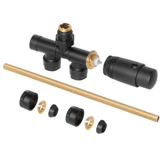 Zestaw termostatyczny używany w grzejnikach łazienkowych, w których potrzebne jest podłączenie zasilania i powrotu z grzejnika do jednego otworu przyłączeniowego. Zawór może być zamontowany w wersji lewej i prawej prostej oraz lewej i prawej kątowej.