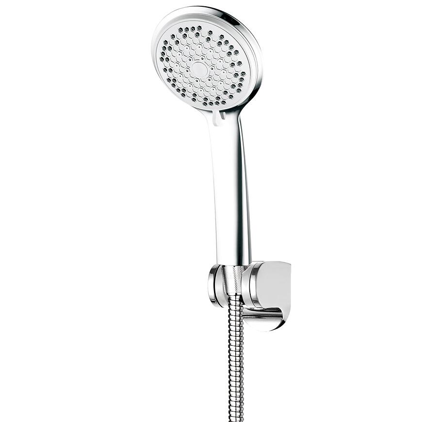 Rączka wykonana z tworzywa sztucznego oraz wąż w metalowym oplocie gwarantują odporność na wilgoć i codzienne użytkowanie. System montażu naścienny umożliwia szybkie i stabilne zamocowanie zestawu.