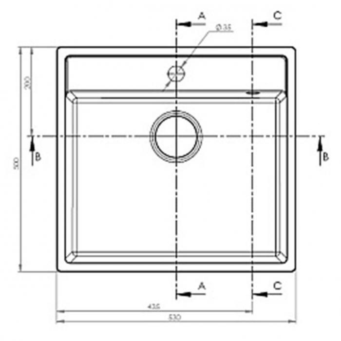 Zlew jest wpuszczany, odwracalny i wyposażony w jedną prostokątną komorę o wymiarach 530x500x190 mm. Posiada syfon z korkiem automatycznym, co zwiększa komfort codziennego użytkowania. Zlew nie posiada ociekacza, a minimalna szerokość szafki do montażu wynosi 60 cm, co pozwala na łatwe dopasowanie zlewu do różnych mebli kuchennych.