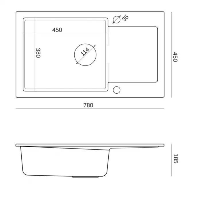 Model posiada jedną komorę o wymiarach 380x450x185 mm oraz praktyczny ociekacz, który pozwala wygodnie suszyć naczynia i utrzymać porządek na blacie. Kompaktowe wymiary zlewu (780x450 mm) sprawiają, że idealnie sprawdzi się w kuchniach o różnej wielkości.