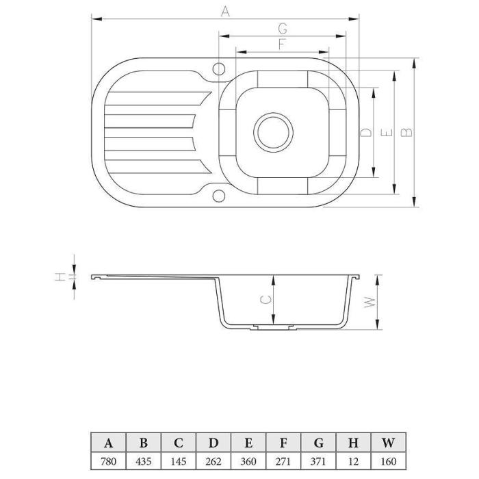 Zlew Granitowy jednokomorowy wpuszczany z ociekaczem, w zestawie korek automatyczny, odwracalny.