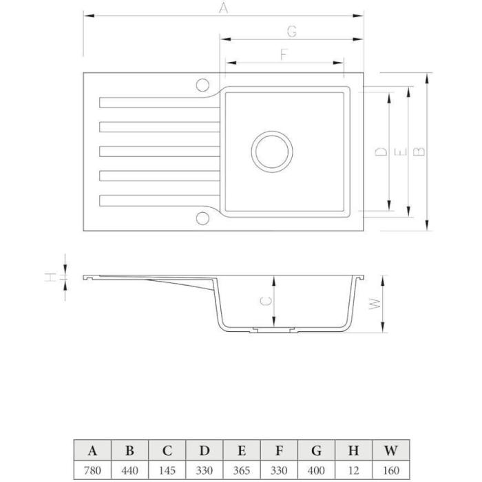 Zlew Granitowy o wymiarach 44x78x14,5 cm jednokomorowy