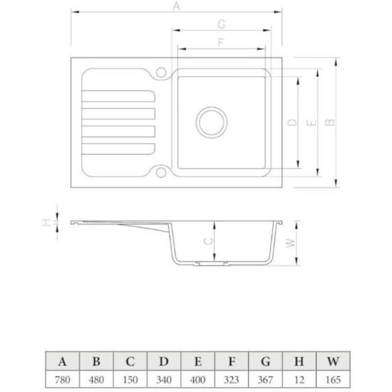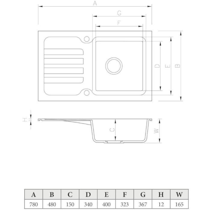 Model posiada jedną funkcjonalną komorę o wymiarach 367x400x150 mm oraz praktyczny ociekacz, który ułatwia suszenie naczyń i zwiększa komfort pracy w kuchni. Kompaktowe wymiary (780x480 mm) sprawiają, że zlew idealnie pasuje do mniejszych przestrzeni, zachowując pełną wygodę użytkowania.