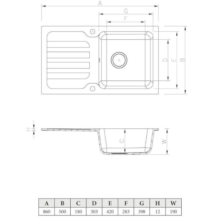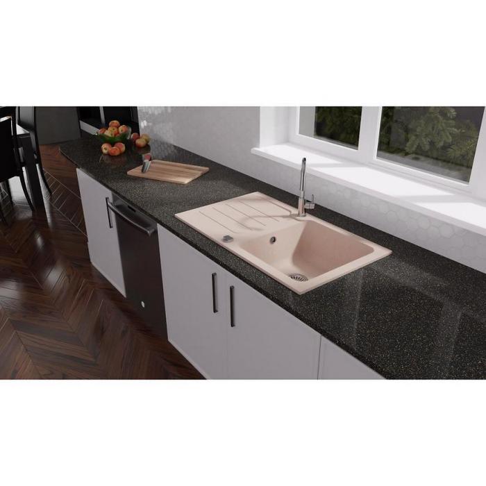 Zlew Granitowy jednokomorowy wpuszczany z ociekaczem, w zestawie korek automatyczny, odwracalny.
