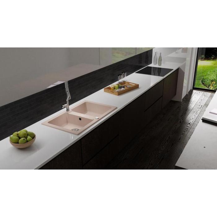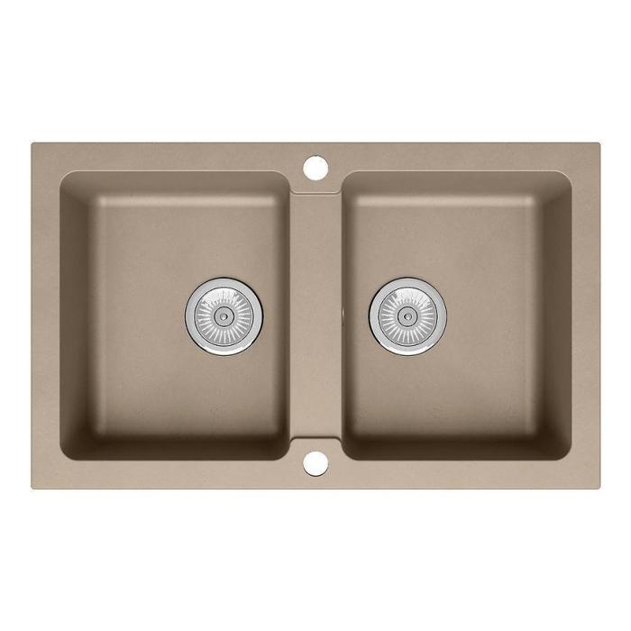Zlew Granitowy dwukomorowy wpuszczany, w zestawie korek automatyczny, odwracalny. Wymiary komór 29,4x37,4x14,5 i 29,4x37,4x14,5 cm.
