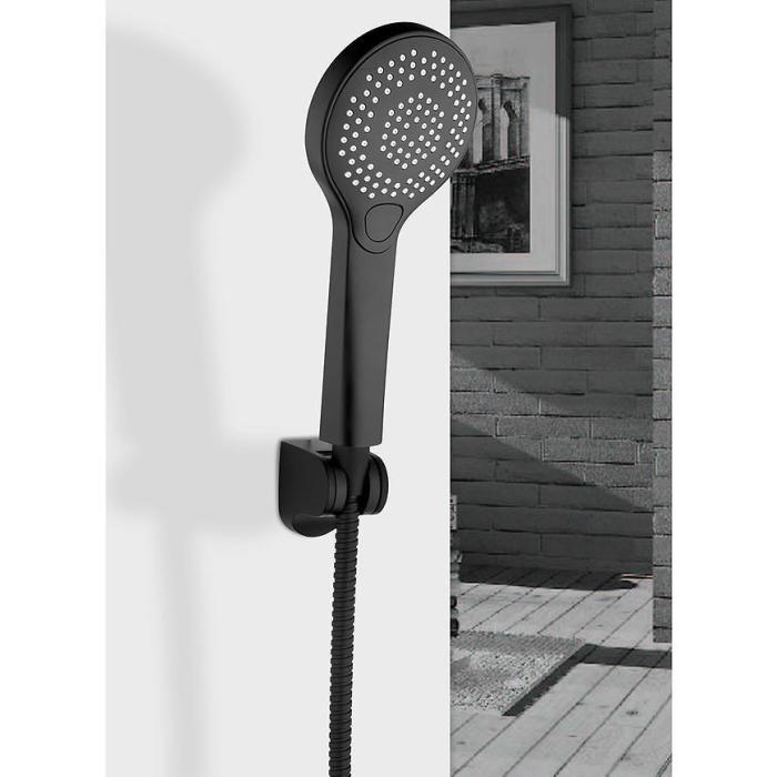Zestaw Wannowy Andros wykonany z tworzywa sztucznego w kolorze czarny mat, wąż natryskowy o długości 150 cm.