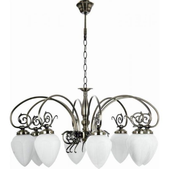 Duży żyrandol z ośmioma kloszami białymi zamykanymi w dół. Idealny do pomieszczeń reprezentacyjnych. Kolor patyny sprawdza się w pomieszczeniach modernistycznych, stylowych i klasycznych.